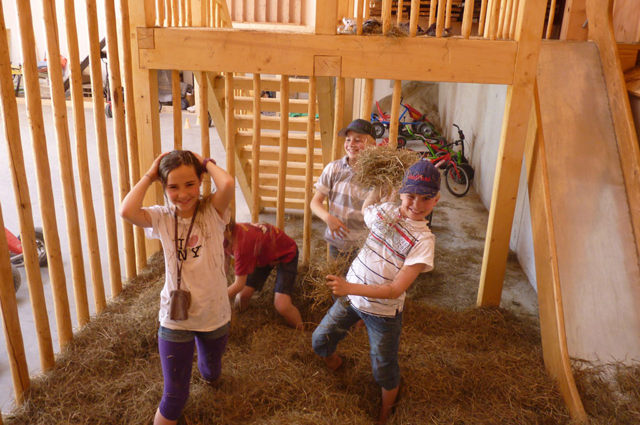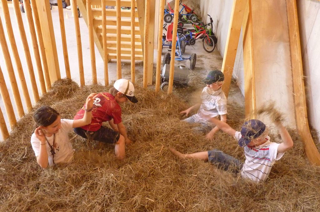 Eine weitere Attraktion ist unsere Heuhüpfburg. Im Heu hüpfen und toben, von oben hinunter springen oder über die Rutschbahn sausen. Das Heu riechen und fühlen, oder gleich eine richtige Heuschlacht mit der ganzen Familie veranstalten.