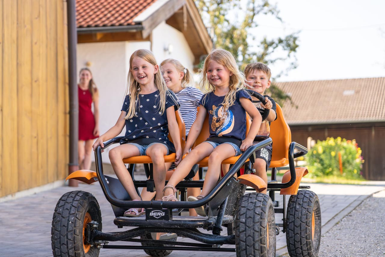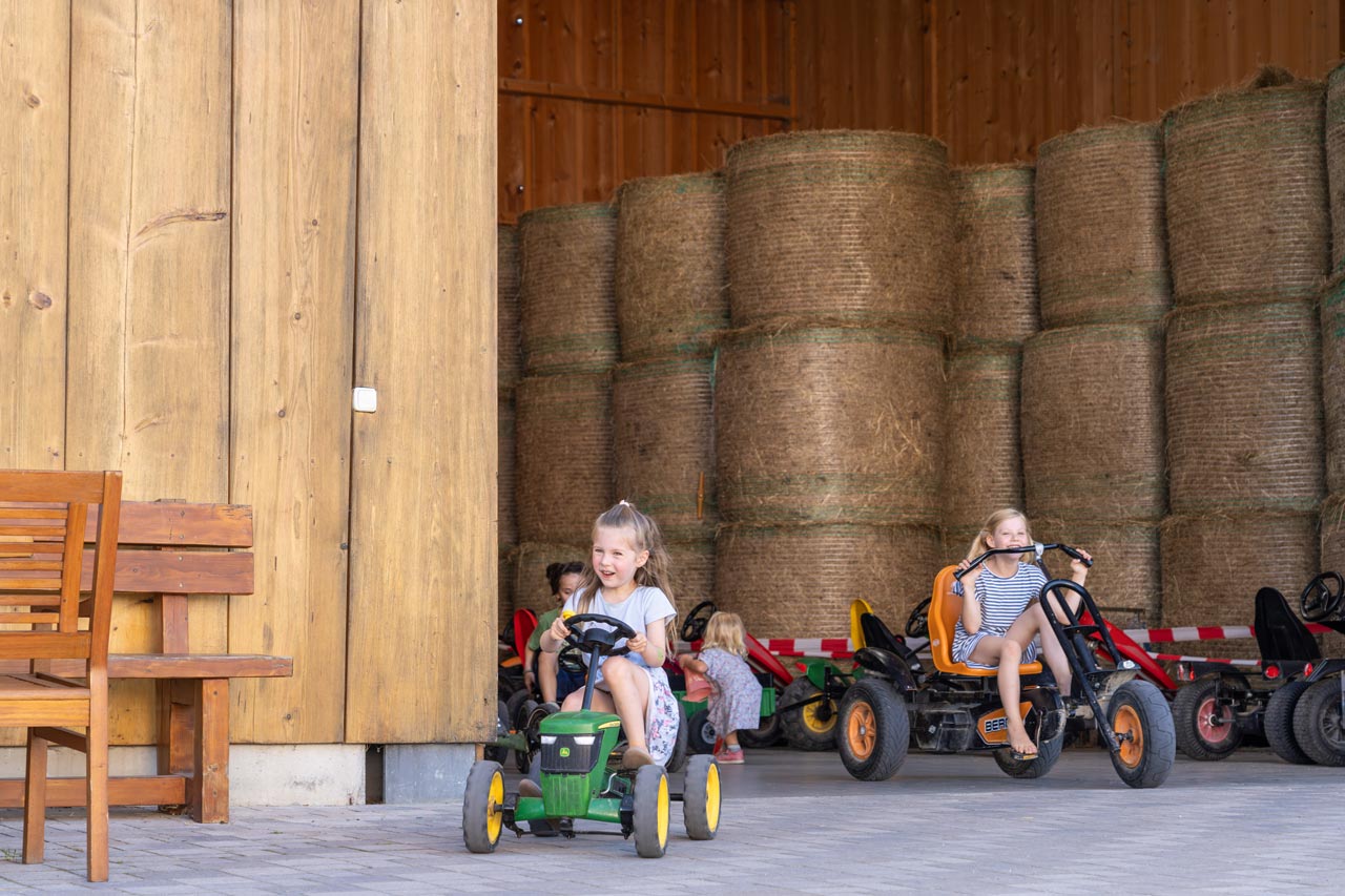 In der Spielscheune können Ihre Kinder bei jedem Wetter mit den verschiedenen Fahrzeugen ihre Runden drehen. Für die Kinder jeden Alters, auch den Kleinsten gibt es tolle Bobbycars & Trettraktoren mit Anhänger, Laufrad, Kettcars in verschiedenen Größen und sogar ein Familienkettcar, sowie ein Indoor Trampolin zum Springen.