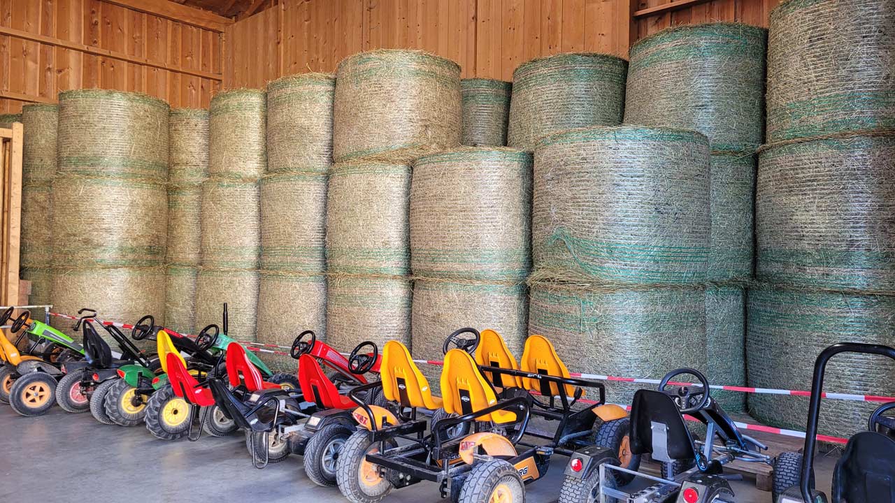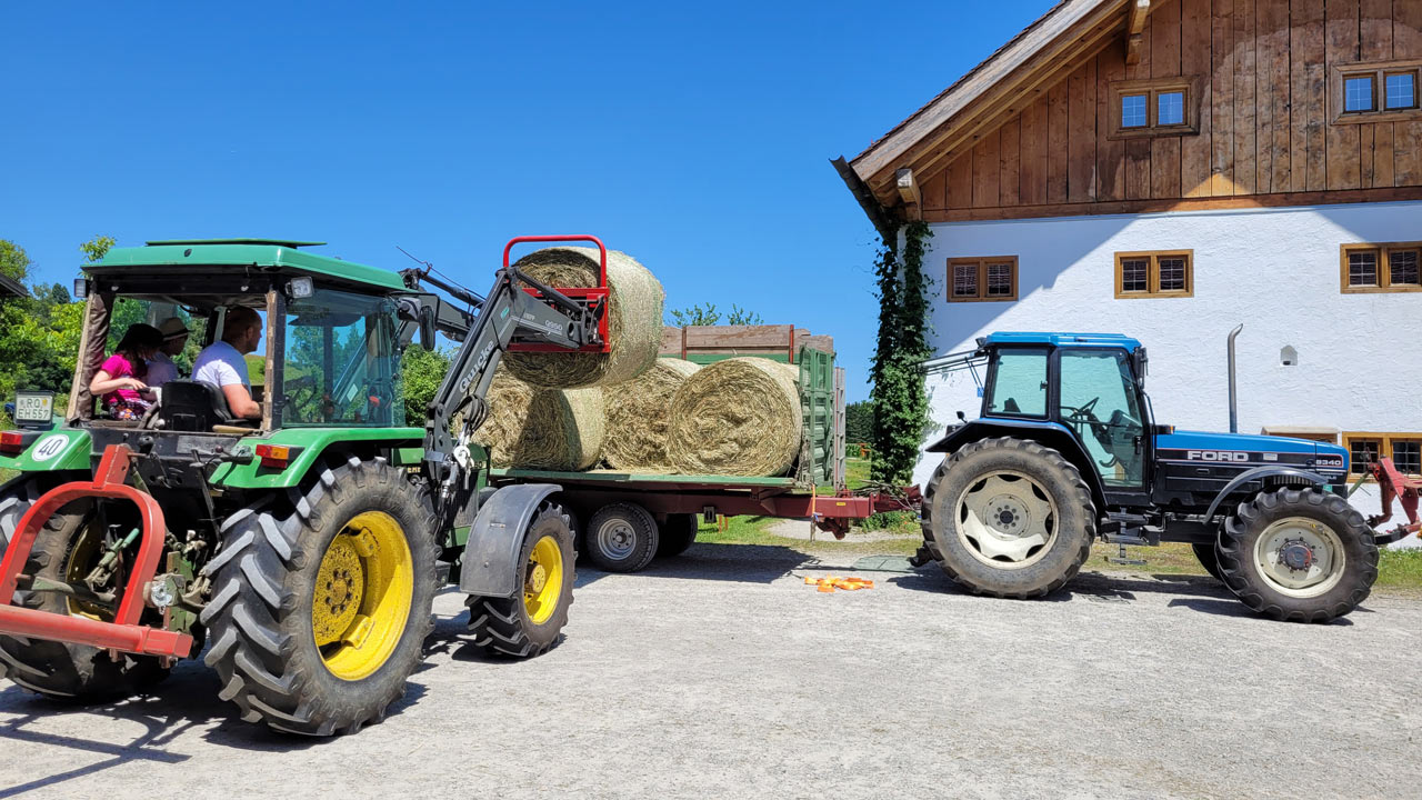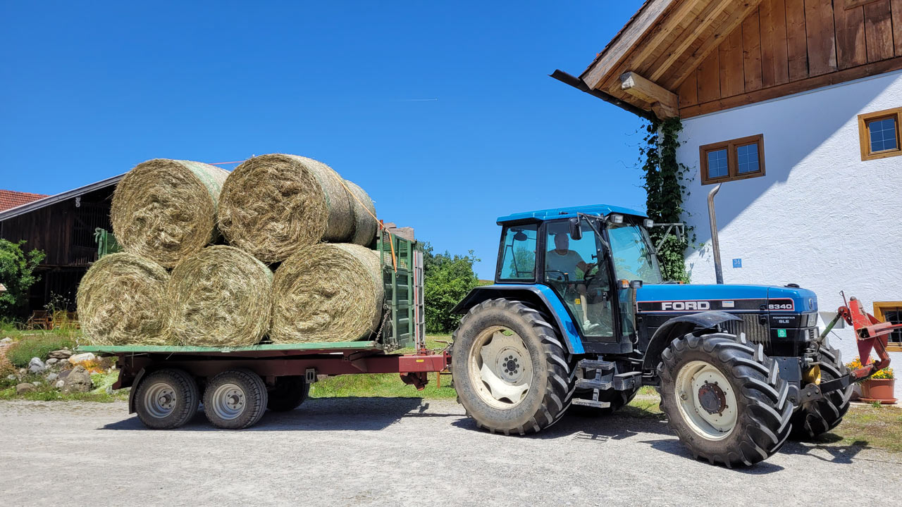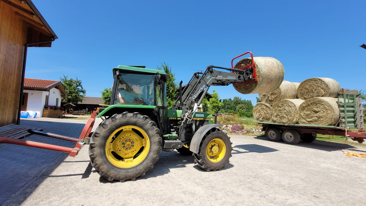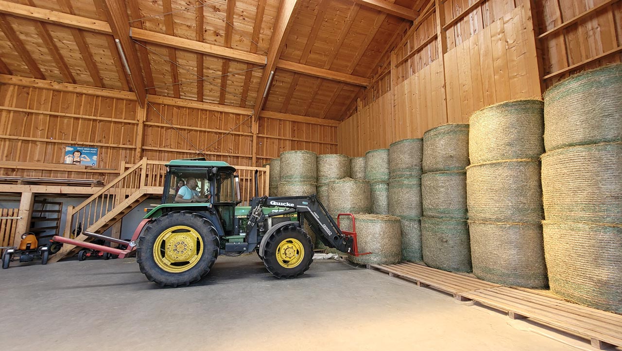 Das Futter für die Tiere erzeugen wir selbst. Je nach Jahreszeit und Wetter könnt ihr bei der Heuernte oder Getreideernte dabei sein.