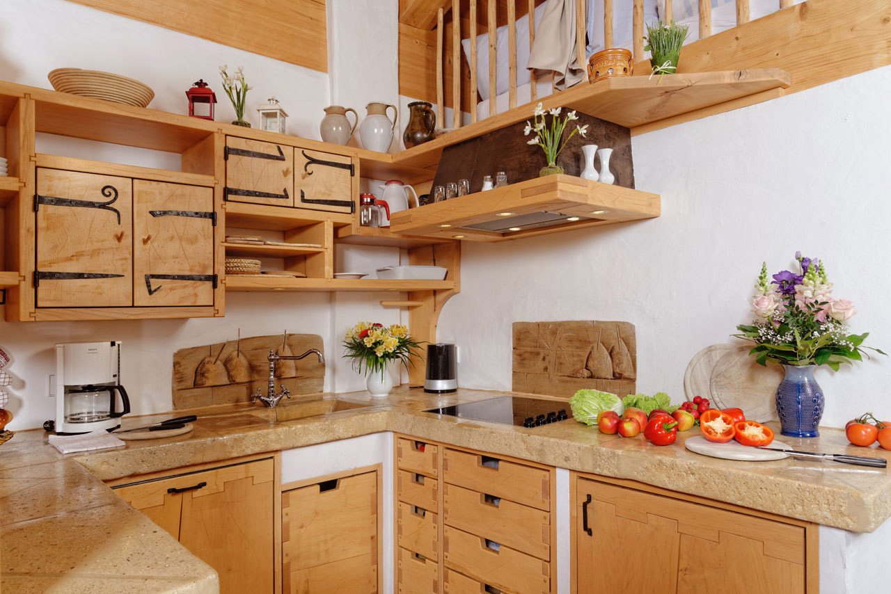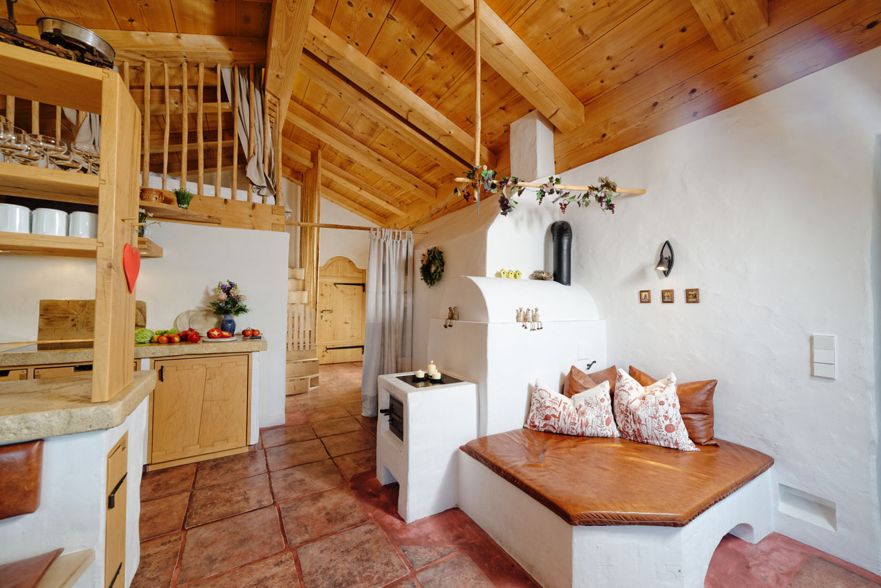 • Küche, Esszimmer und Wohnzimmer in offener Wohnform mit kuscheligem Kachelofen